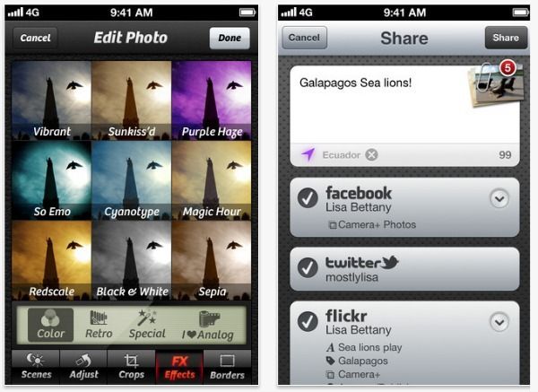 Camera+: es una de esas que nos permite además de la edición la posibilidad de tomar las fotografías en tiempo real, e ir aplicándoles los filtros para poder ver cómo nos van quedando, algo que muchos fotógrafos aseguran que es lo que les falta a la mayoría de herramientas de diseño